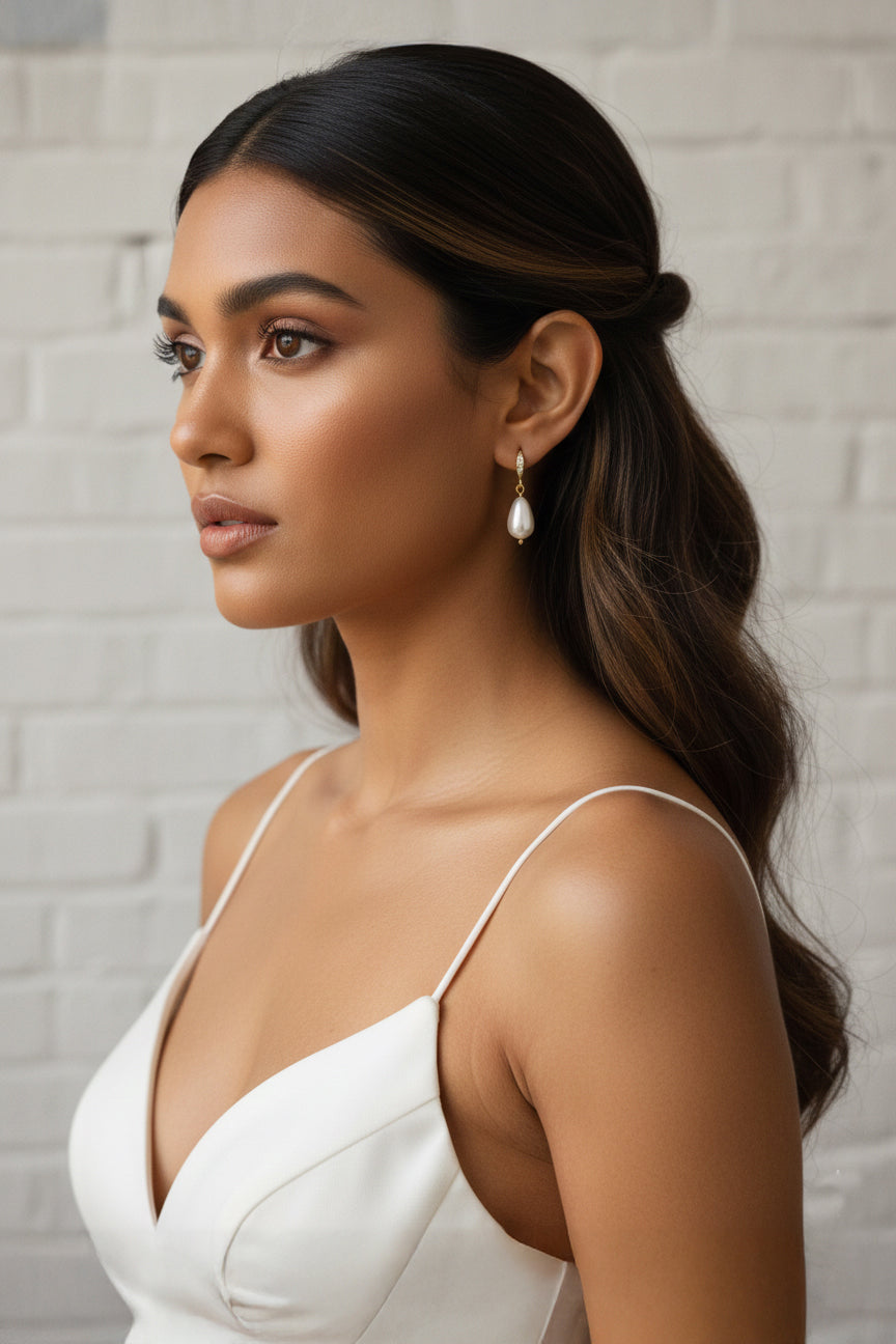 Pearl teardrop earrings featuring 16k gold plated or rhodium plated hooks offer a graceful silhouette for any wedding ensemble. The delicate hooks are meticulously encrusted with cubic zirconia, providing a subtle shimmer that leads the eye to a perfectly shaped teardrop pearl. These bridal drop earrings are designed for the minimalist who appreciates fine details and high-quality finishes. The slender hook design ensures a secure yet lightweight feel, making them an ideal choice for long wedding days or formal evening events where a classic aesthetic is desired.