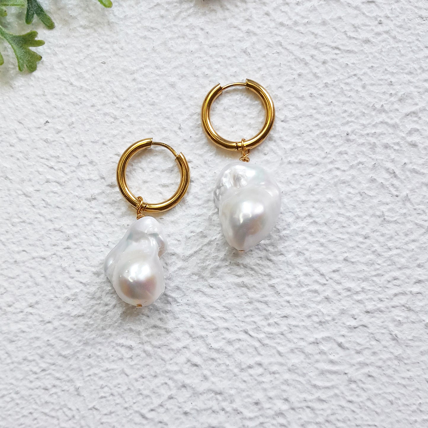 Make a statement with these unique gold fireball pearl hoop earrings. Made with 18k gold plated steel and baroque pearls, these 14mm hoops are ideal for Mother's Day or everyday wear.