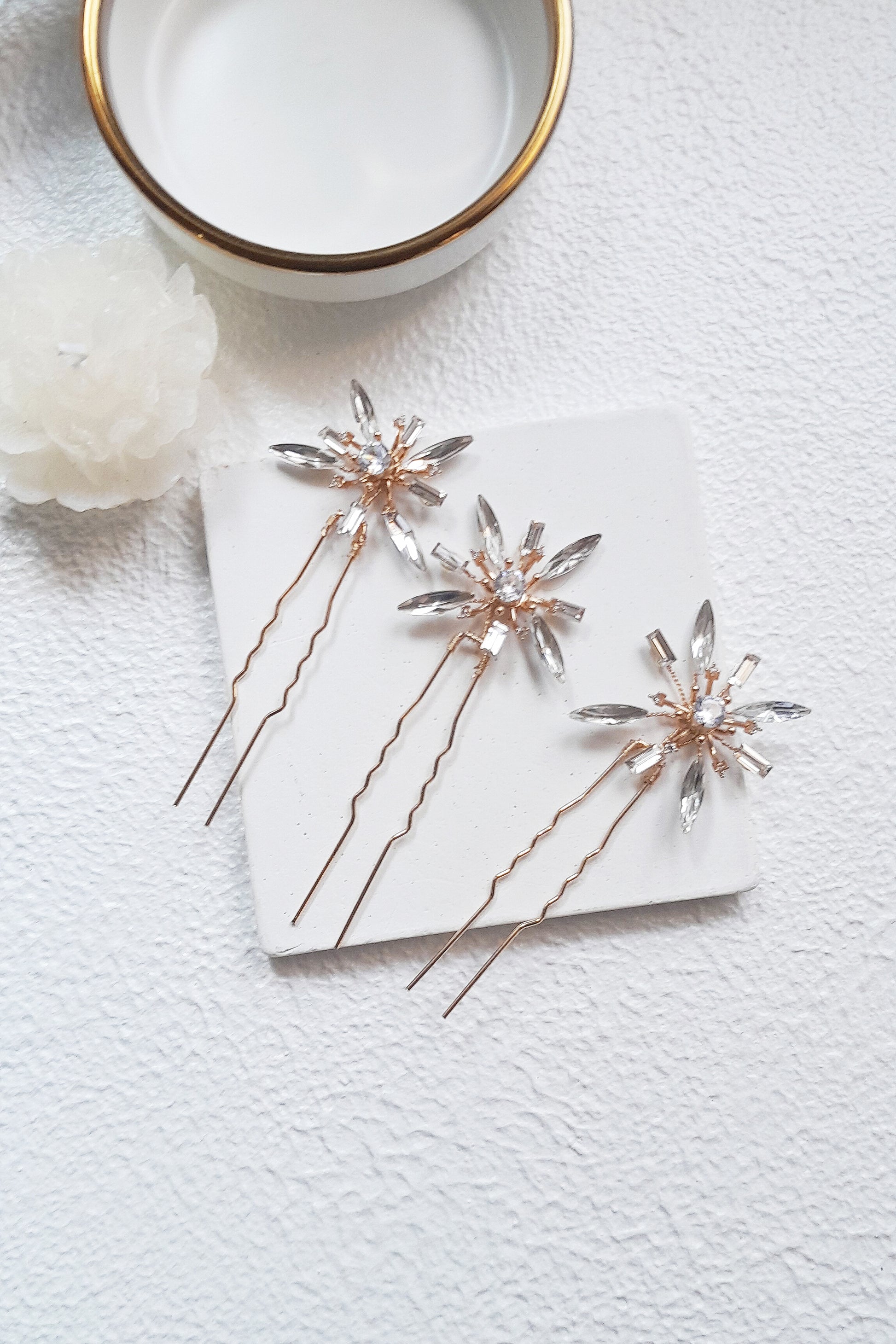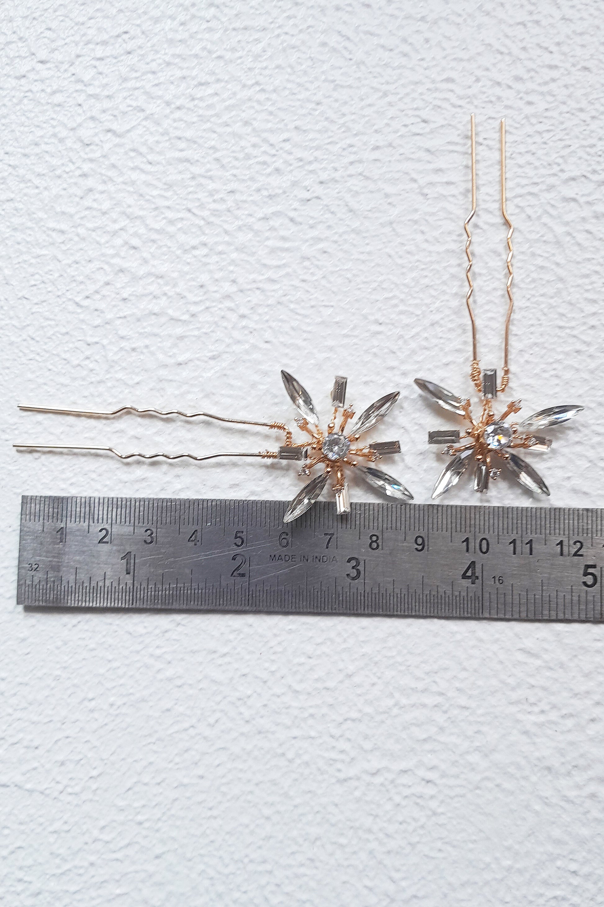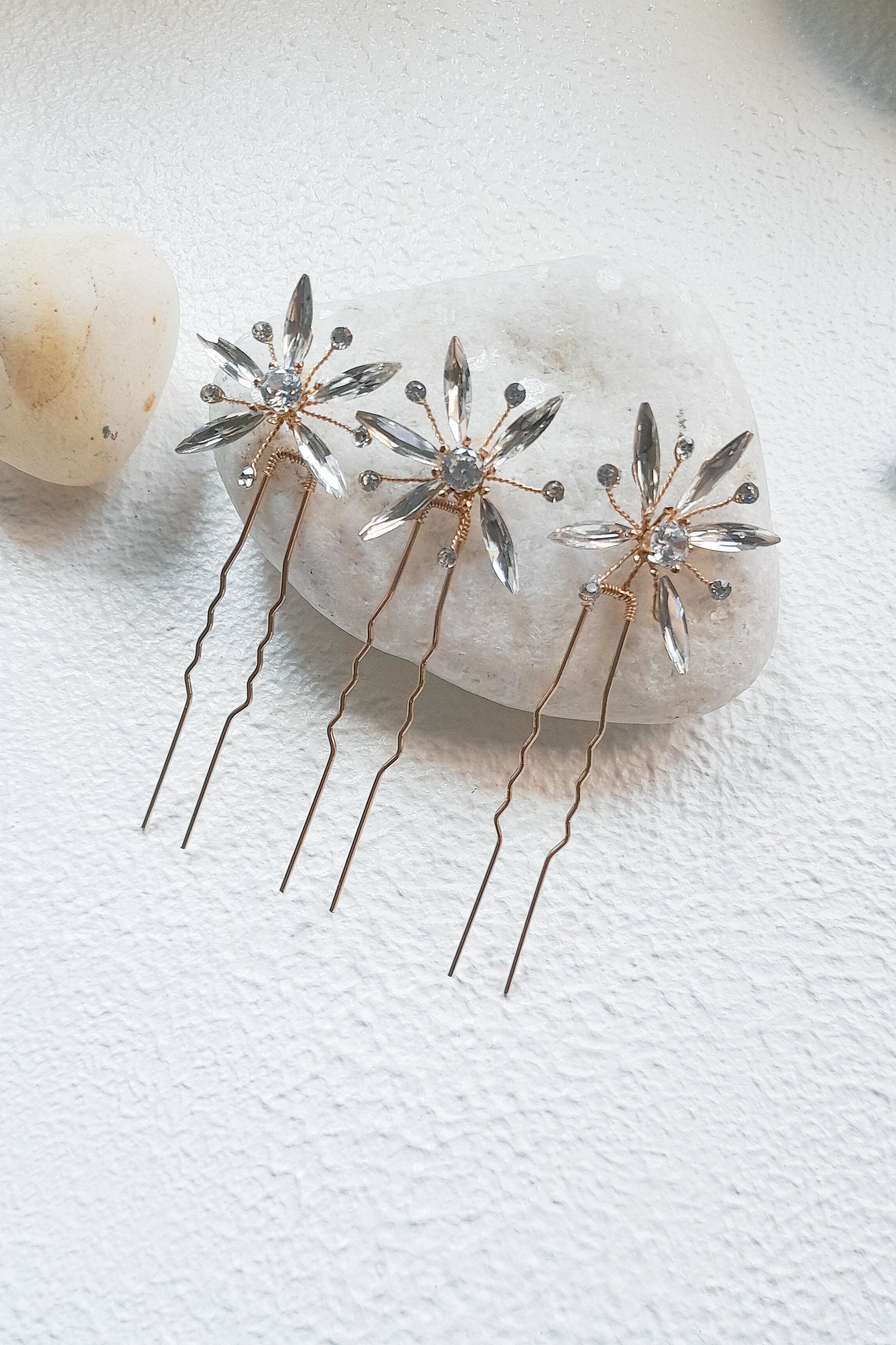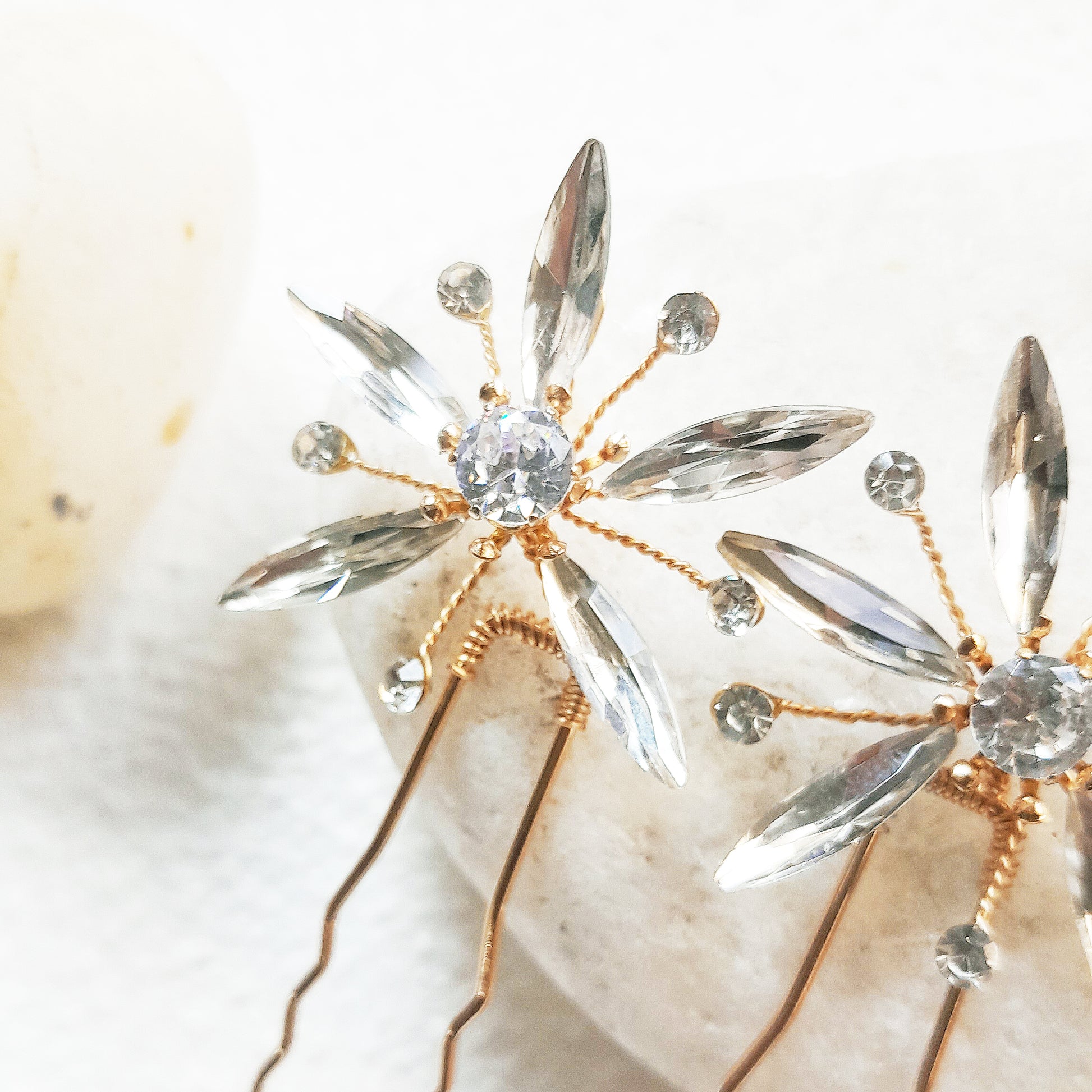 Add a touch of celestial elegance to your special day with these dazzling crystal starburst bridal hair pins! Each handcrafted piece features sparkling rhinestones arranged in a delicate starburst design, creating a touch of whimsical charm and effortless beauty. Available in gold to complement your bridal ensemble, these versatile hair accessories can be styled individually or together for a captivating look. Perfect for brides, bridesmaids, prom, or any special occasion where you want to shine.