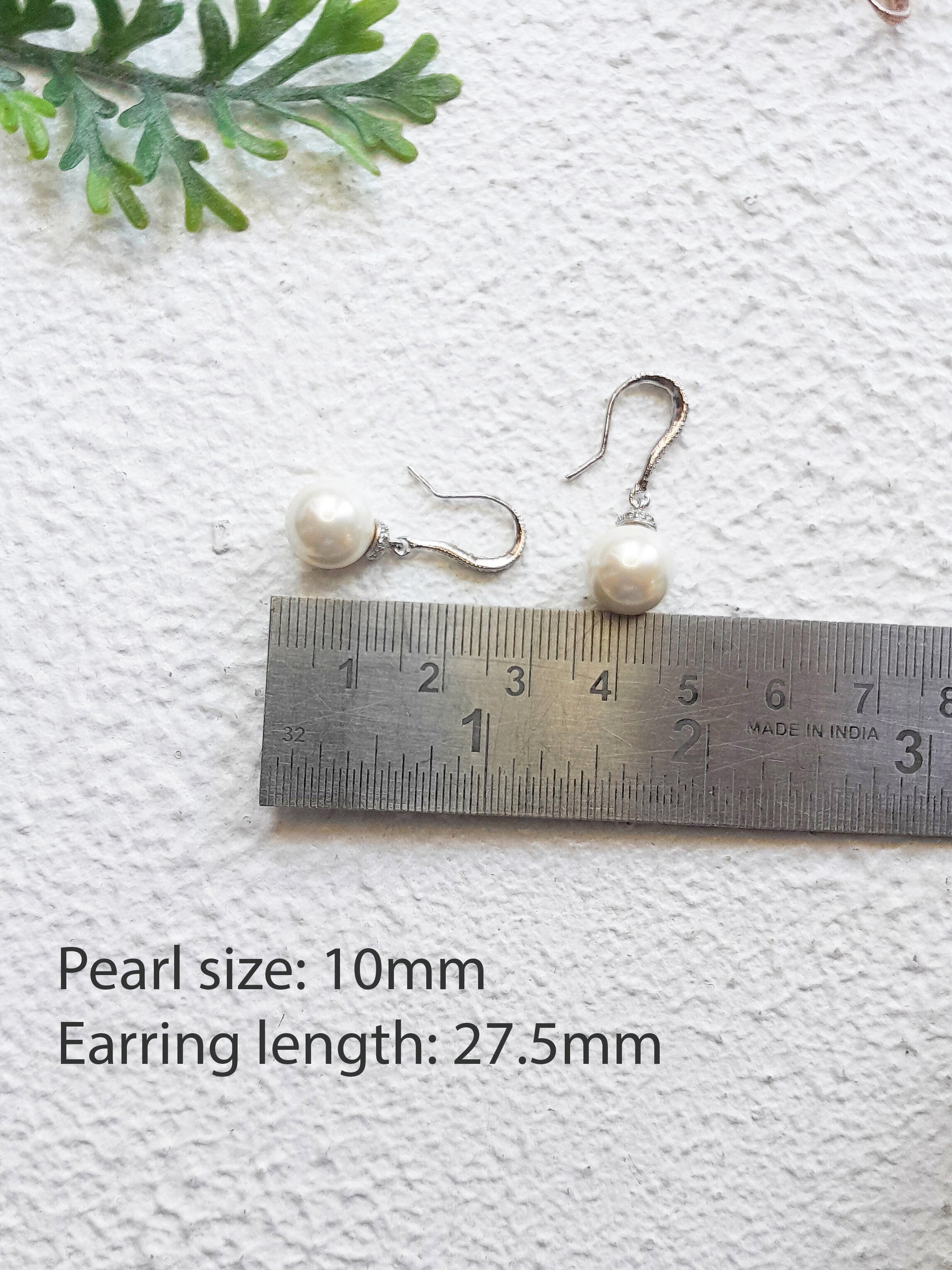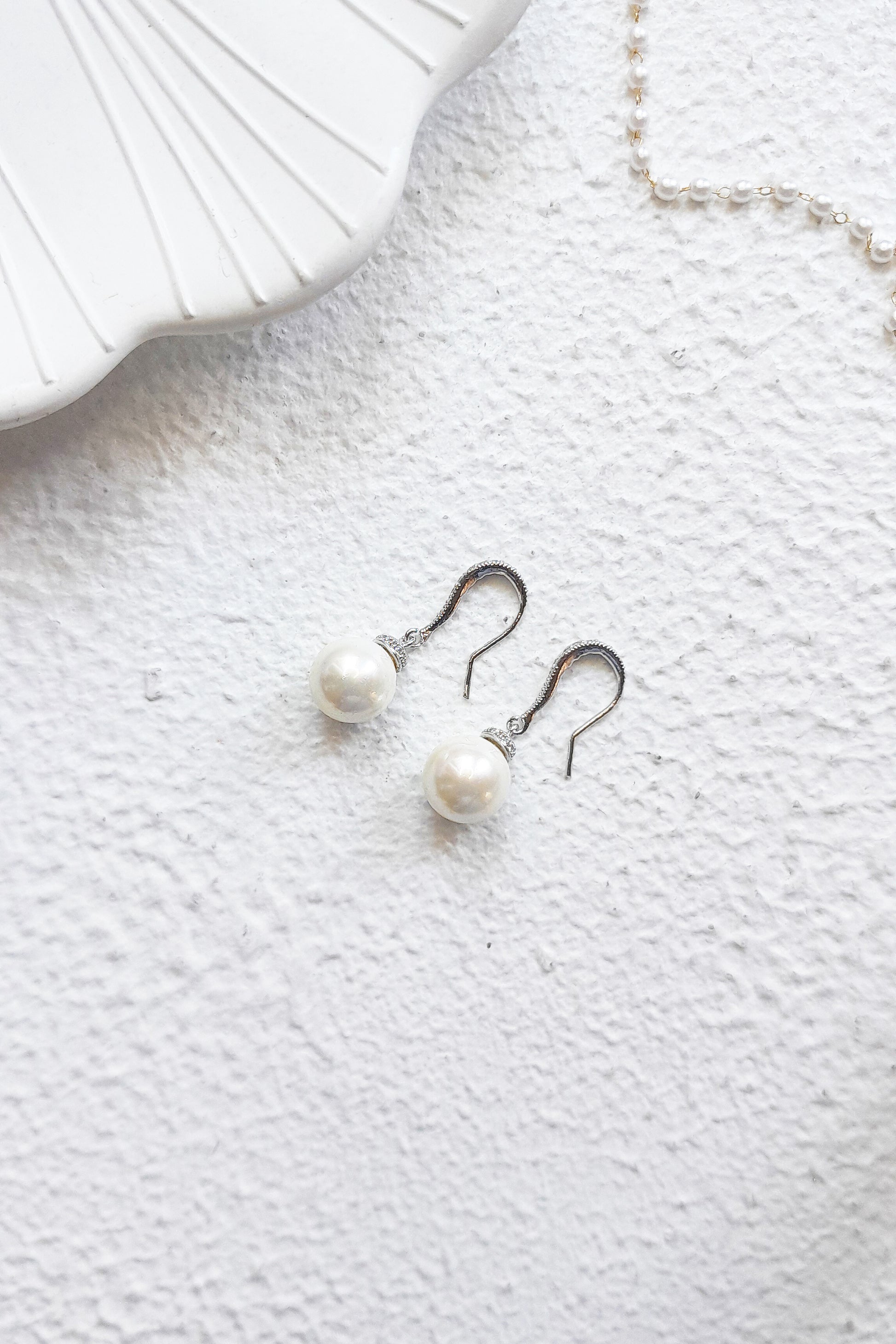 Elegant pearl drop bridal earrings featuring luminous cream shell pearls (available in 10mm, 12mm, or 14mm) suspended from shimmering cubic zircon encrusted hooks. Crafted in your choice of 16k gold-plated brass, cool rhodium silver plated brass, or warm rose gold plated brass, these earrings offer timeless sophistication for the bride. These versatile pearl drop earrings are not only ideal for the bride but also make thoughtful gifts for bridesmaids and the Mother of the Bride. The combination of the classic pearl and the subtle sparkle of the CZ hooks creates a balanced and beautiful accessory for your special day and beyond. Arrives beautifully packaged and gift-ready.