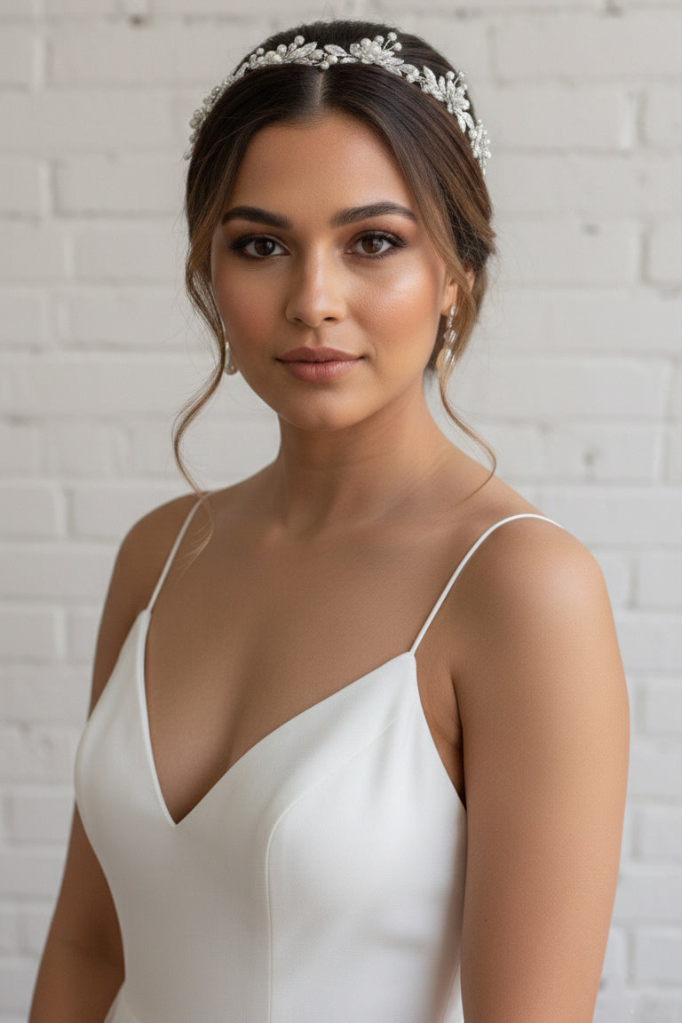 This silver leaf bridal headband brings a touch of nature to your wedding day ensemble. Intricately detailed with metallic foliage, the design features crystal-encrusted flowers and subtle pearl embellishments. The lightweight silver frame ensures a comfortable fit for all-day celebrations, while the artisanal craftsmanship makes it a standout choice for garden or bohemian weddings. This headpiece beautifully secures your veil or adds a shimmering finish to loose waves.